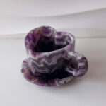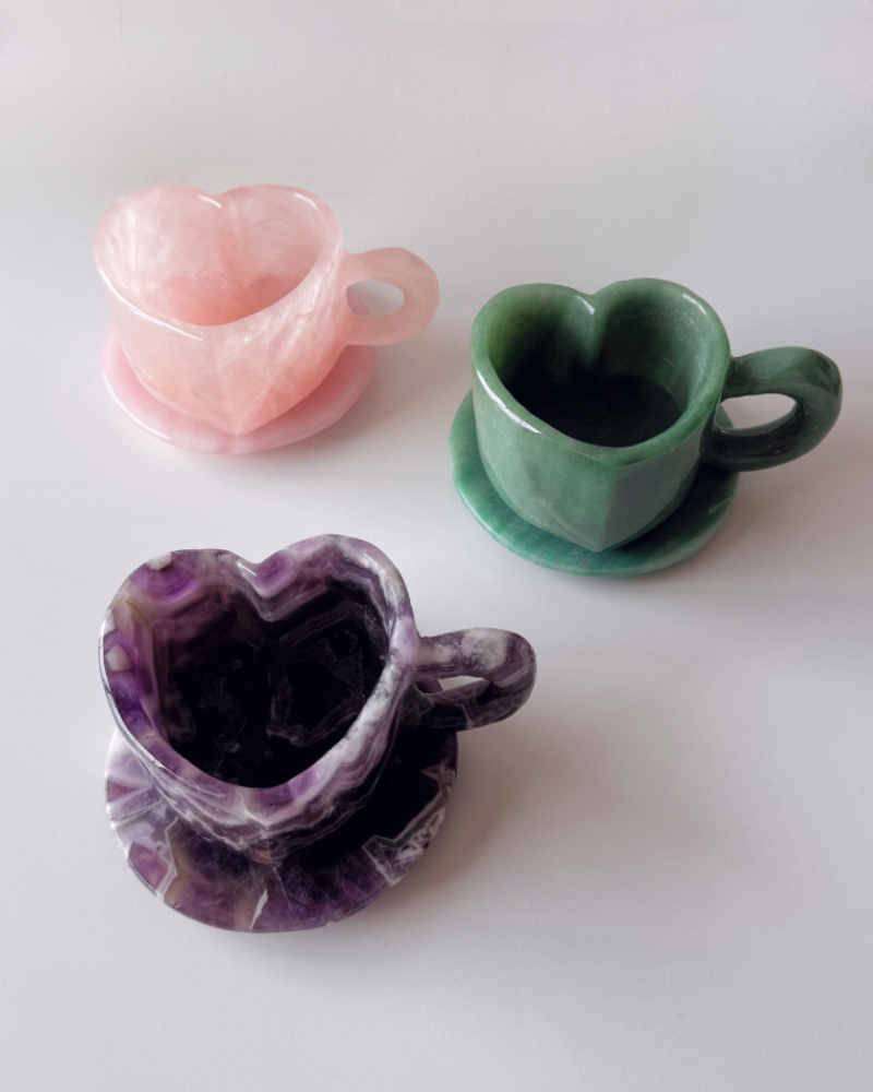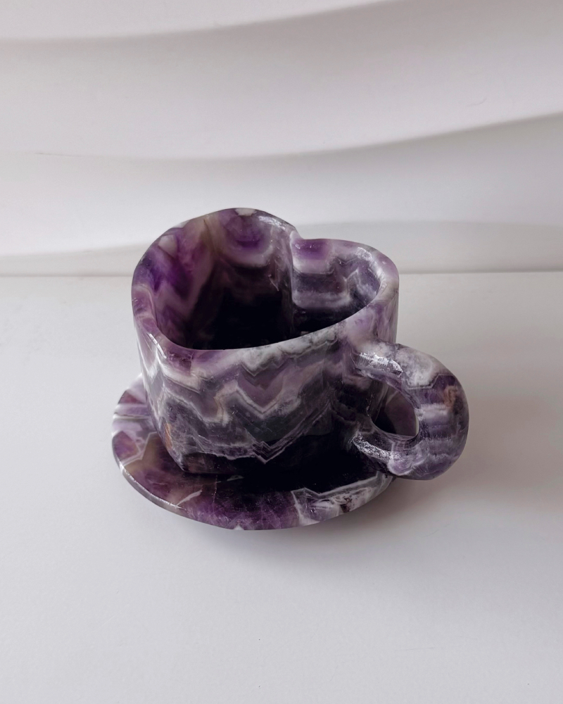 Set de taza y plato de amatista en forma de corazón para bebidas calientes.