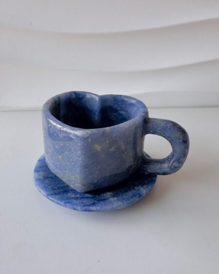 Set de taza y plato en forma de corazón de cuarzo azul o aventurina azul para bebidas frías y calientes.